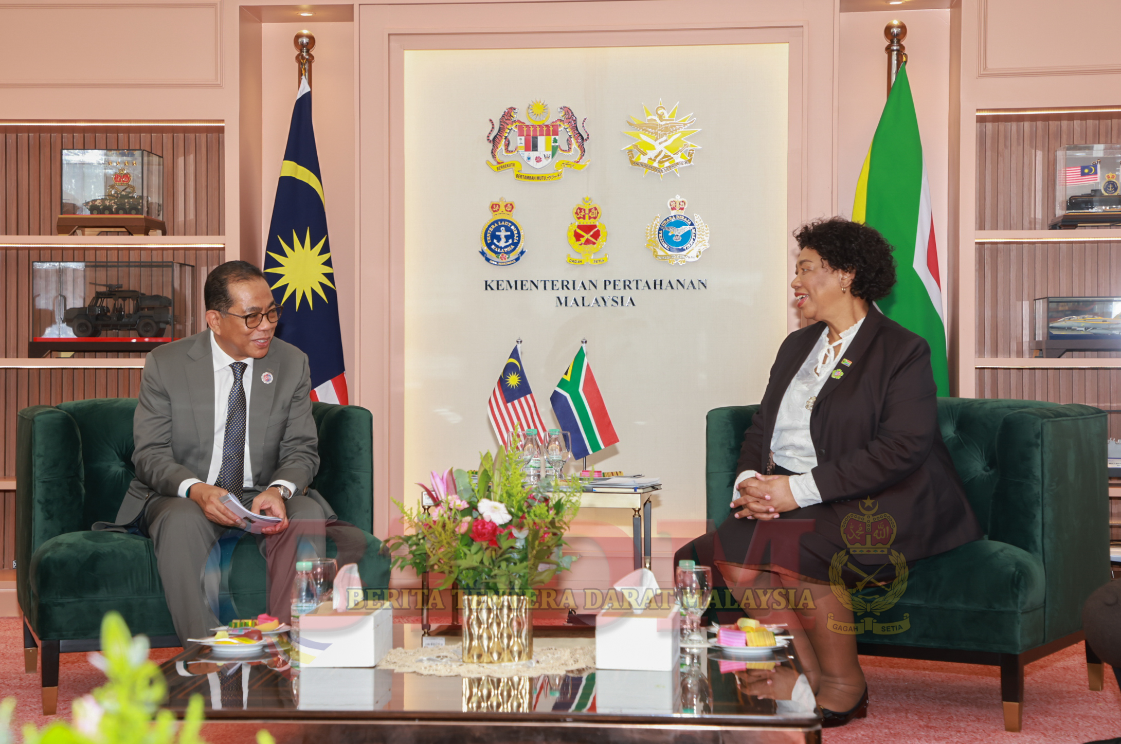 KUALA LUMPUR: Menteri Pertahanan (MENHAN), Dato‘ Seri Mohamed Khaled Nordin menerima Kunjungan Hormat daripada Menteri Pertahanan dan Veteran Tentera Afrika Selatan, Puan Yang Terutama (PYT) Angie Motshekga di pejabatnya pada 27 Okt 2025.